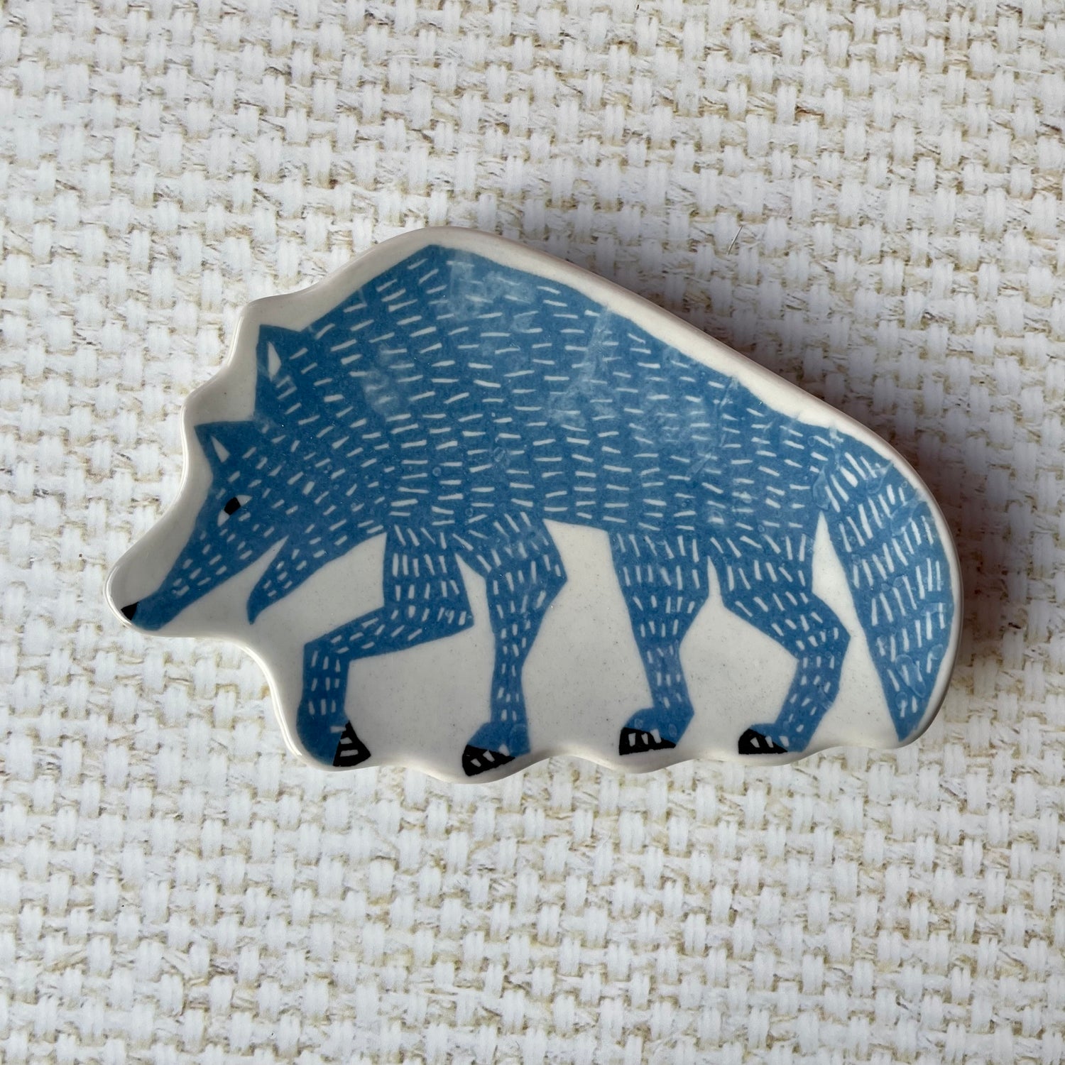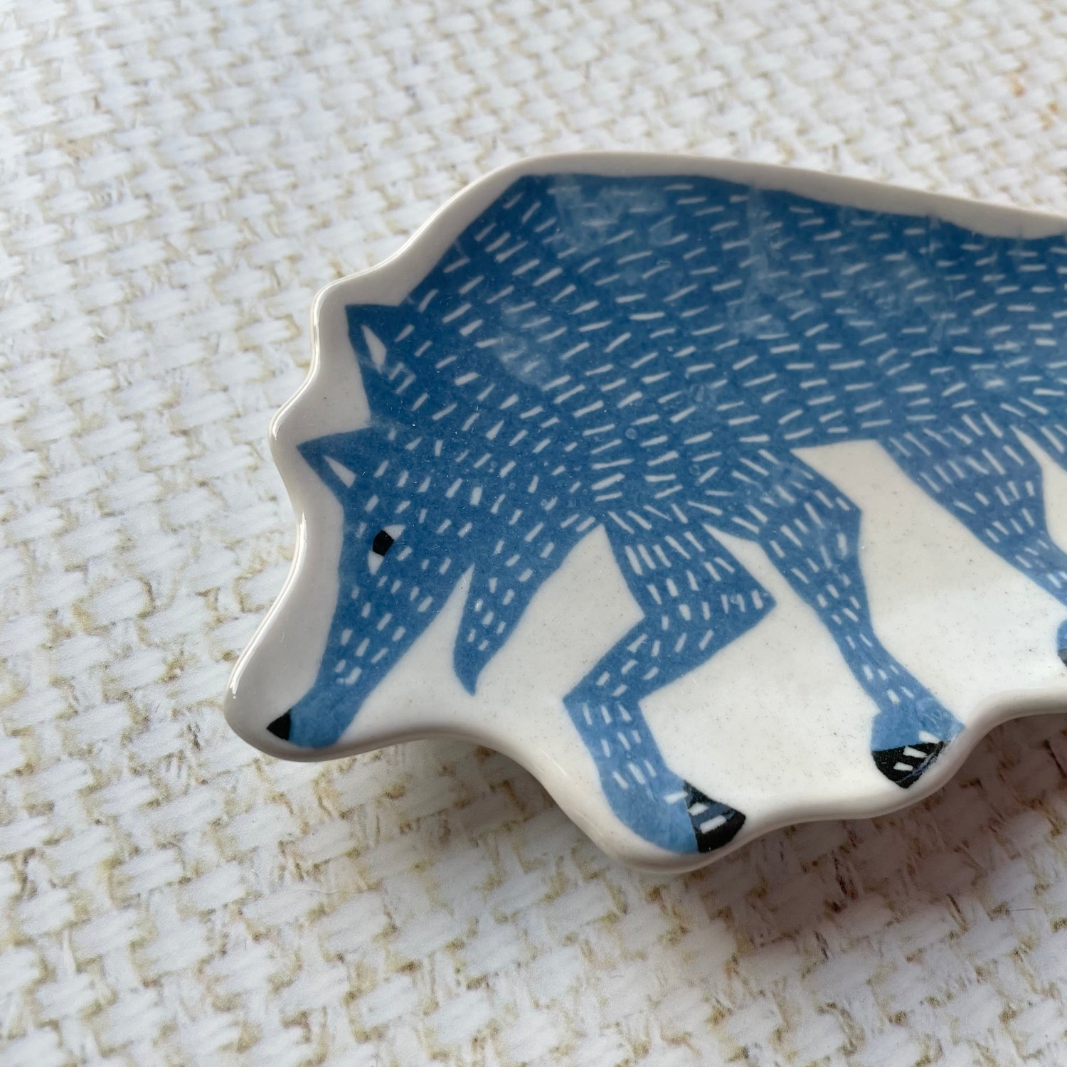 Kata Kata’s unique view of the world and the use of traditional Japanese screen printing technique, katazome, have created textile patterns of distinct animal characters – whales, orangutan, bears, cats, albatross, mandrill, bison and wolves, formed from simple hand drawn linework and a minimal colour palette. These patterns are then transferred to the ceramicware via the technique of inbante, a traditional copper plate transfer method. The Kata Kata team chose to use these traditional manual techniques to create character-filled and unique patterns, that can contain some irregularities such as blurring and colour unevenness in the pattern.