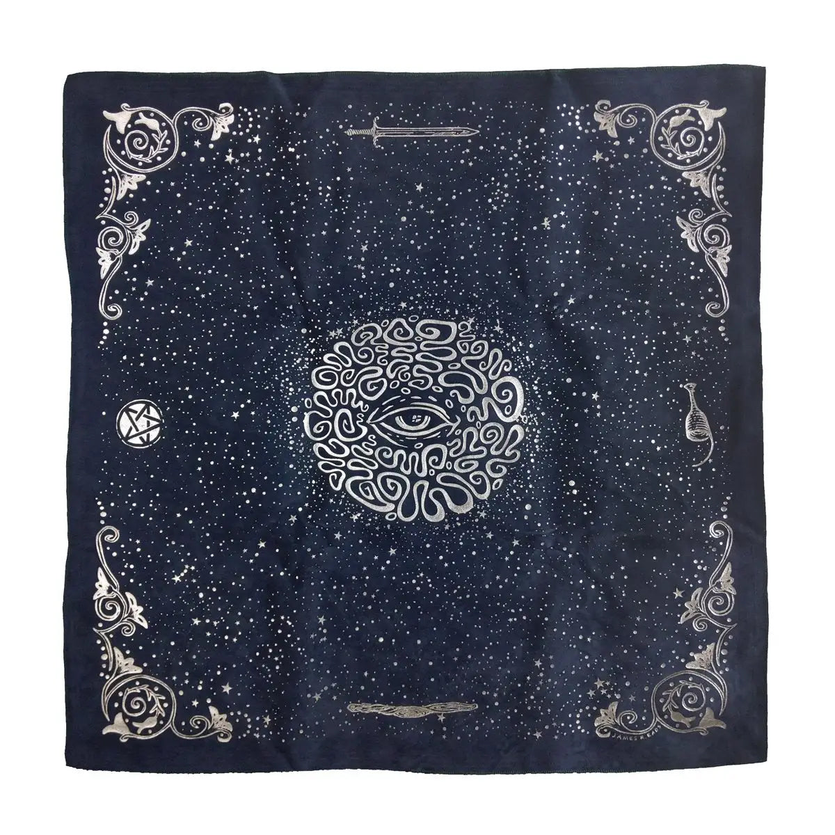A luxurious 22" x 22" double-sided suede altar cloth that honours both the Cosma Visions Oracle and the Prisma Visions Tarot. One side is teal fabric with screen-printed gold, representing Cosma Visions, and the other side is navy fabric with screen-printed silver, representing Prisma Visions.