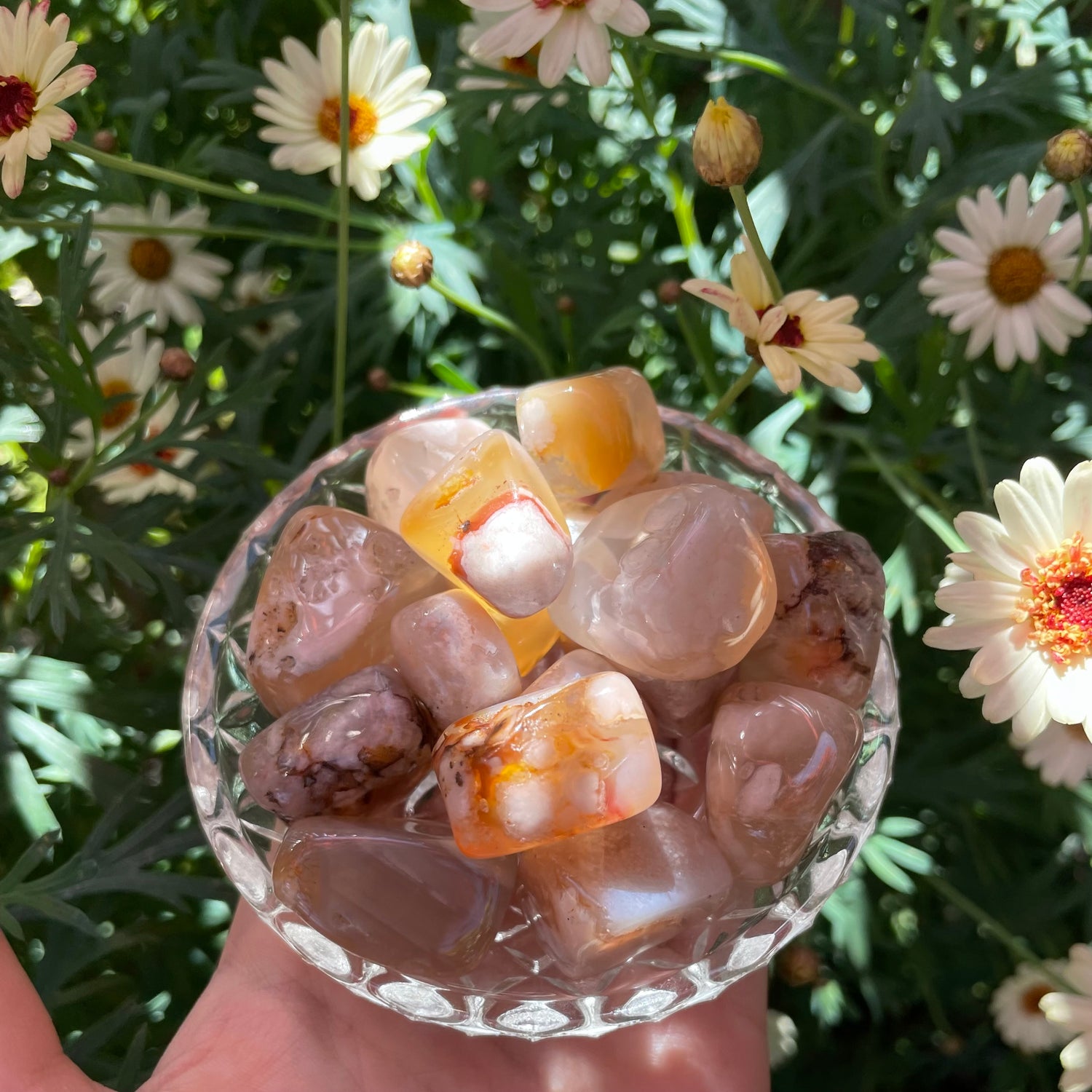 Flower Agate, also known as Cherry Blossom Agate, is a newer discovery from Madagascar. This delicate crystal is characterised by its soft colour and white plumes. Flower Agate is said to radiate a soft, nurturing feminine energy. Known as a powerful manifestation crystal, this gentle stone may also help to focus the mind and aid you in achieving your goals, personal growth and evolution. Place Flower Agate anywhere you want to experience it’s cheerful, empowering vibes, and enjoy the satisfaction it brings into your life.