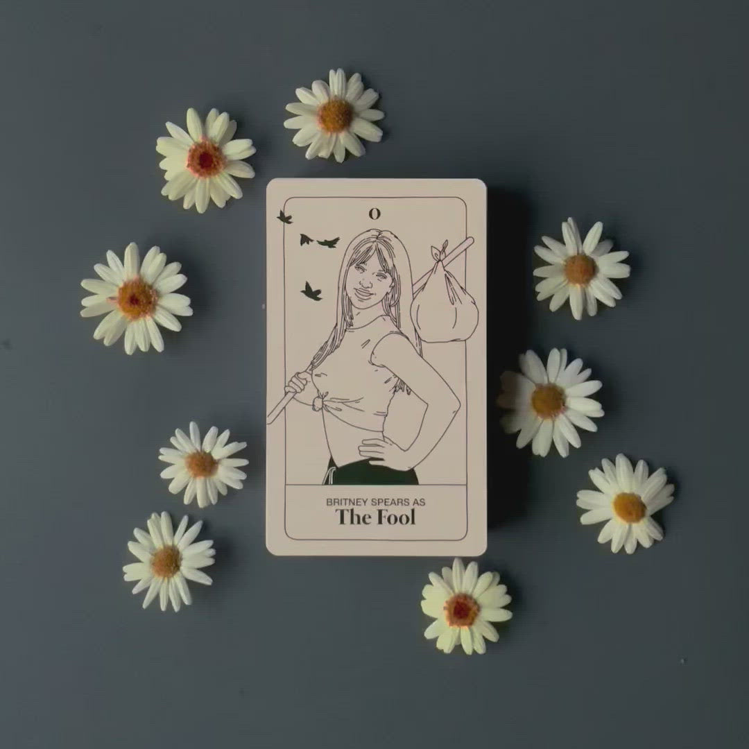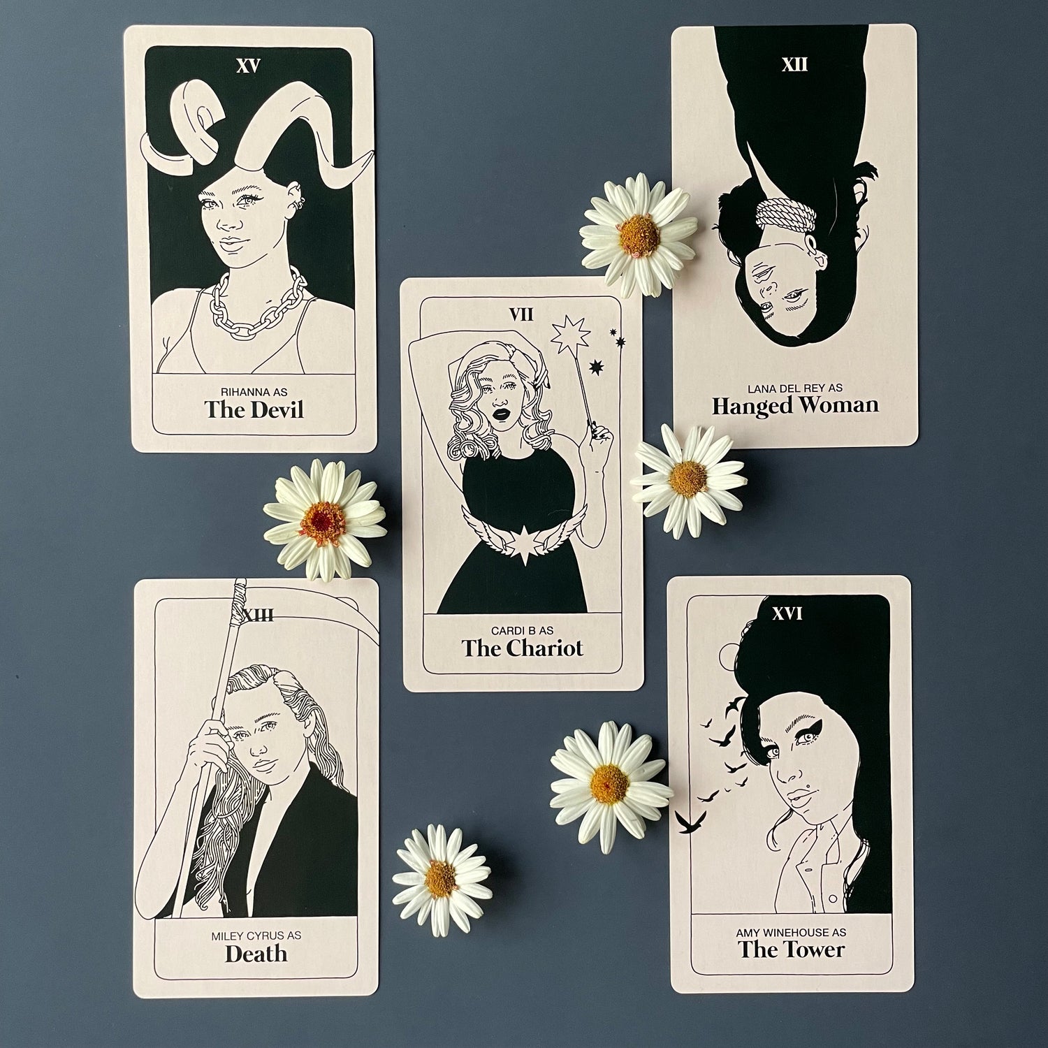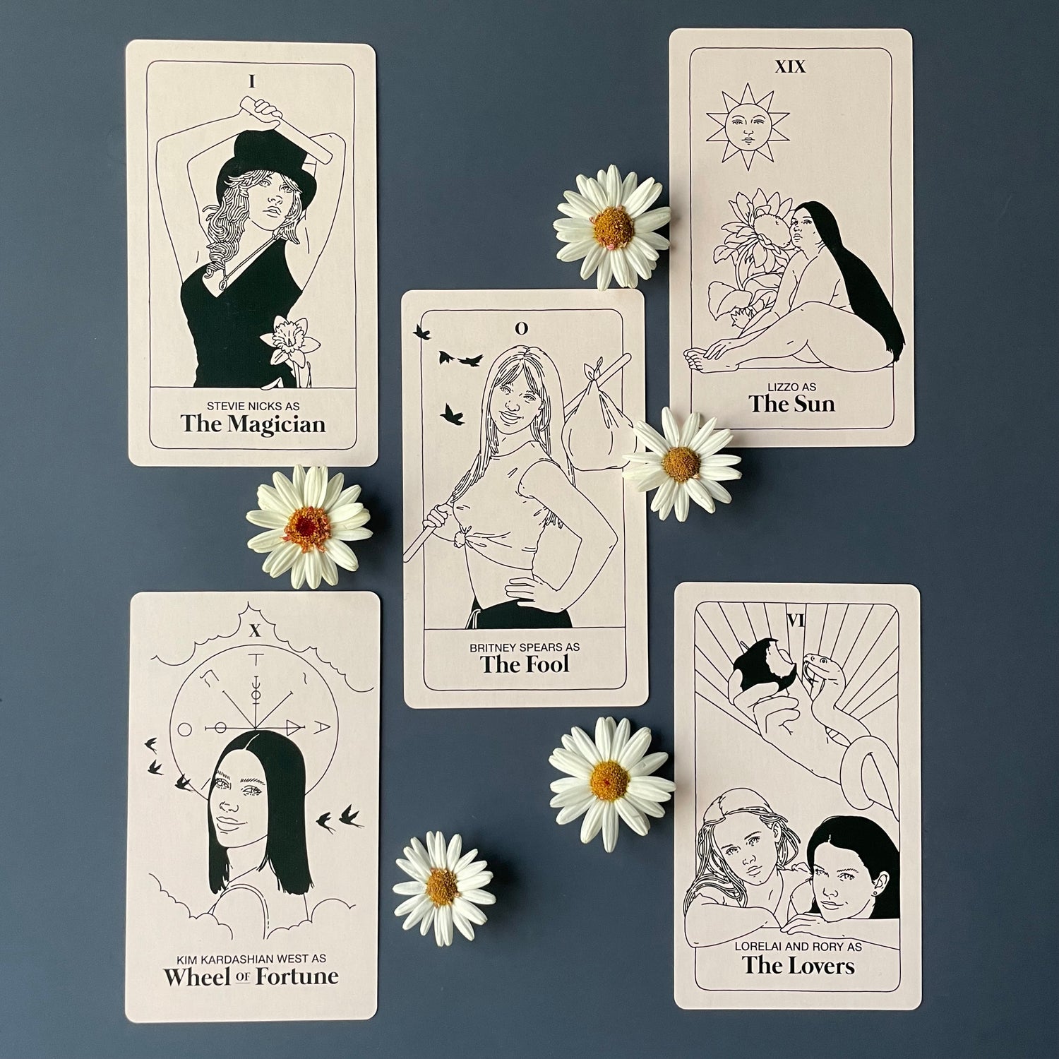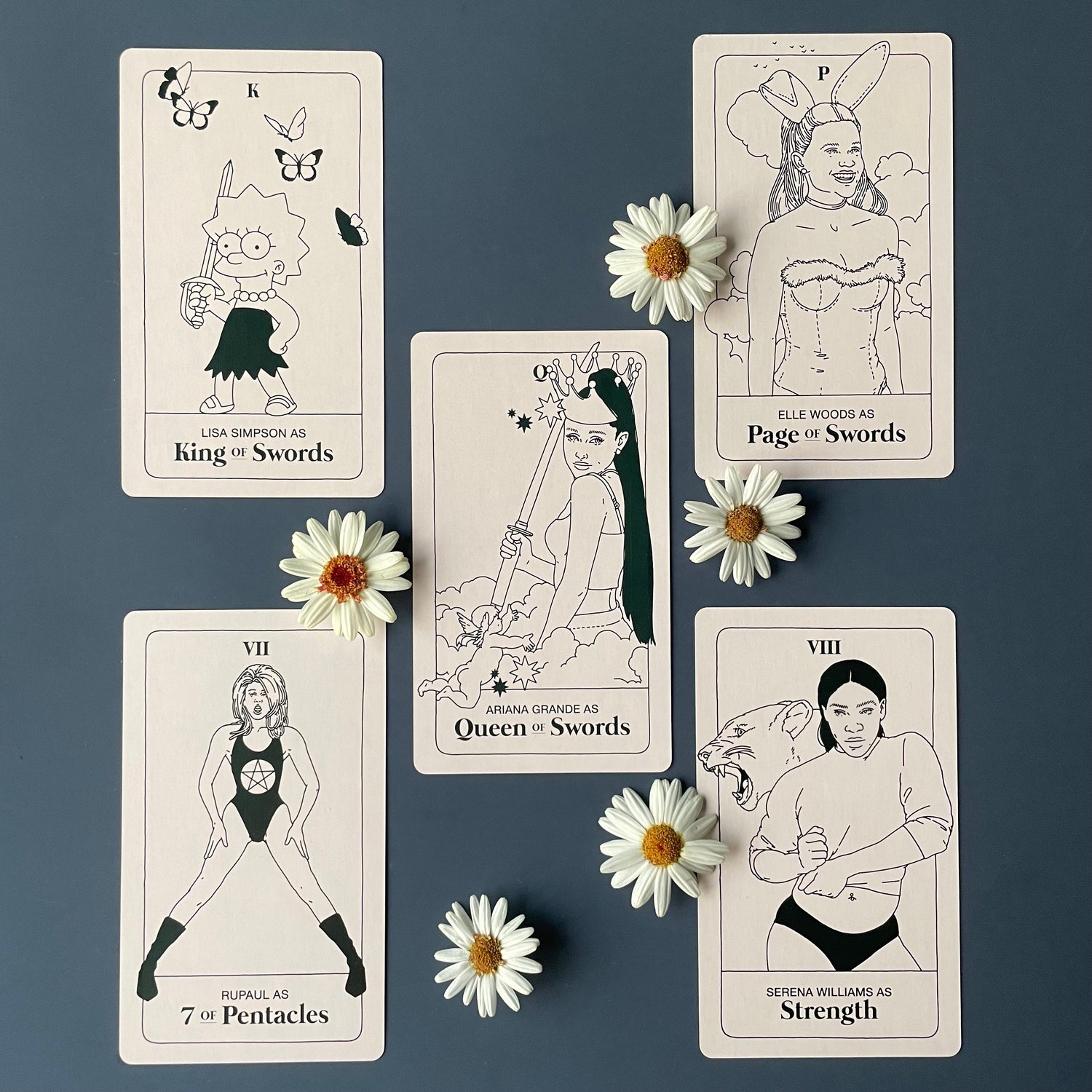78 card Tarot Deck featuring all your fav mostly non-problematic celebs, activists, and heroes. Including but not limited to: Lisa Simpson, Carly Rae Jepsen, Greta Thunberg, Sasha Grey, Brie Larson, Toni Morrison, Cardi B, Kim Kardashian West, Patti Smith, Kacey Musgraves + over 50 more.