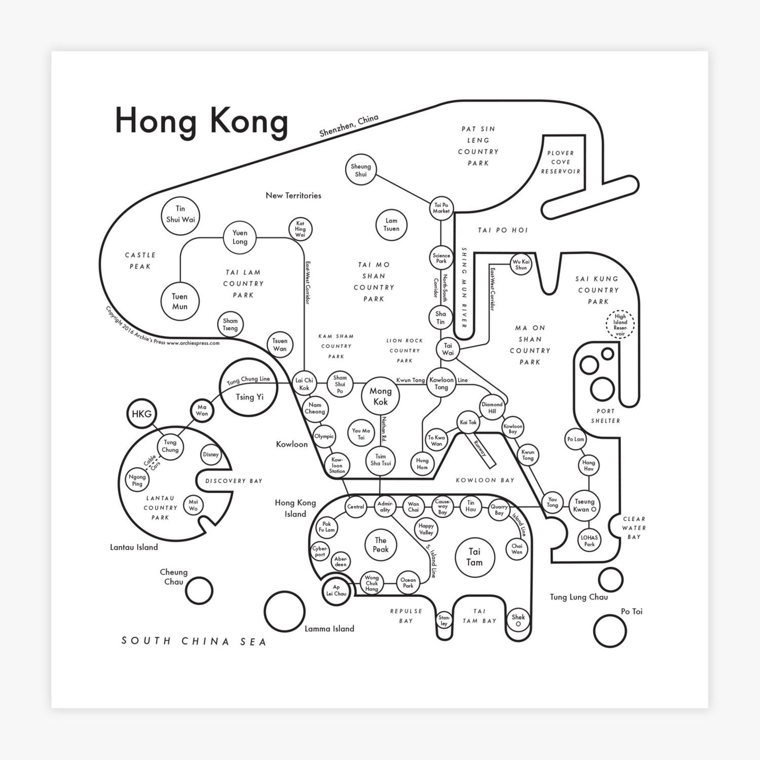 A map of Hong Kong, simplifying all the most complicated edges to a simple and digestible representation. Although ridiculously dense, this Chinese territory is also teeming with park land.