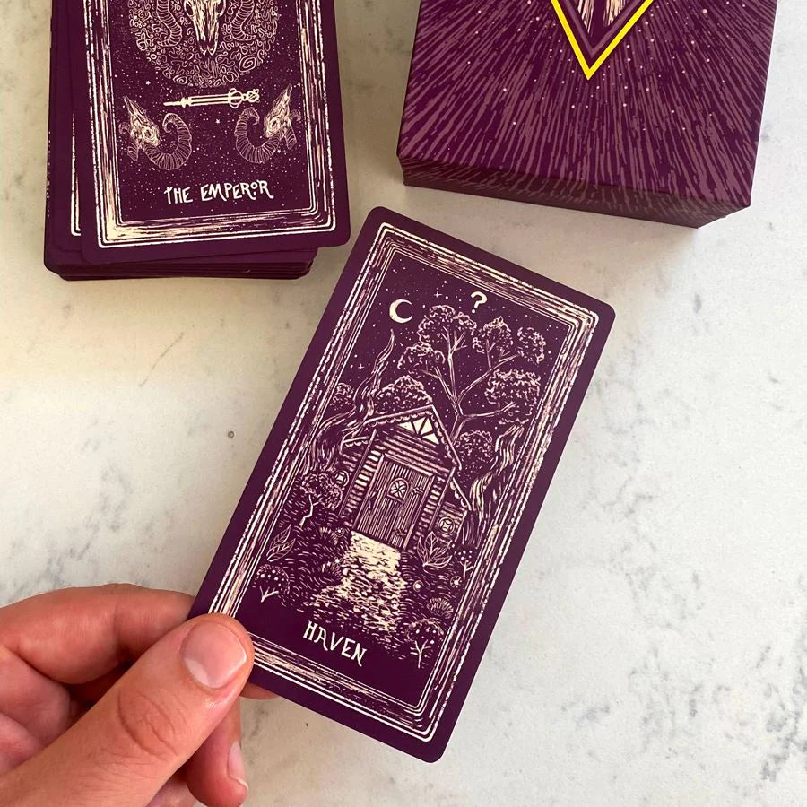 The Light Visions Tarot was James R. Eads’ first tarot deck, released in 2014. Known for his colourful, intricate artwork, Eads has created a glowing and ethereal world in the cards. Each card flows into the next, forming a panorama when laid out side by side. Illustrated in duo-tone deep purple and light cream, Light Visions is a mystical and calming divination tool. This is the 4th Edition of the Light Visions Tarot, with a new 79th card, Haven.
