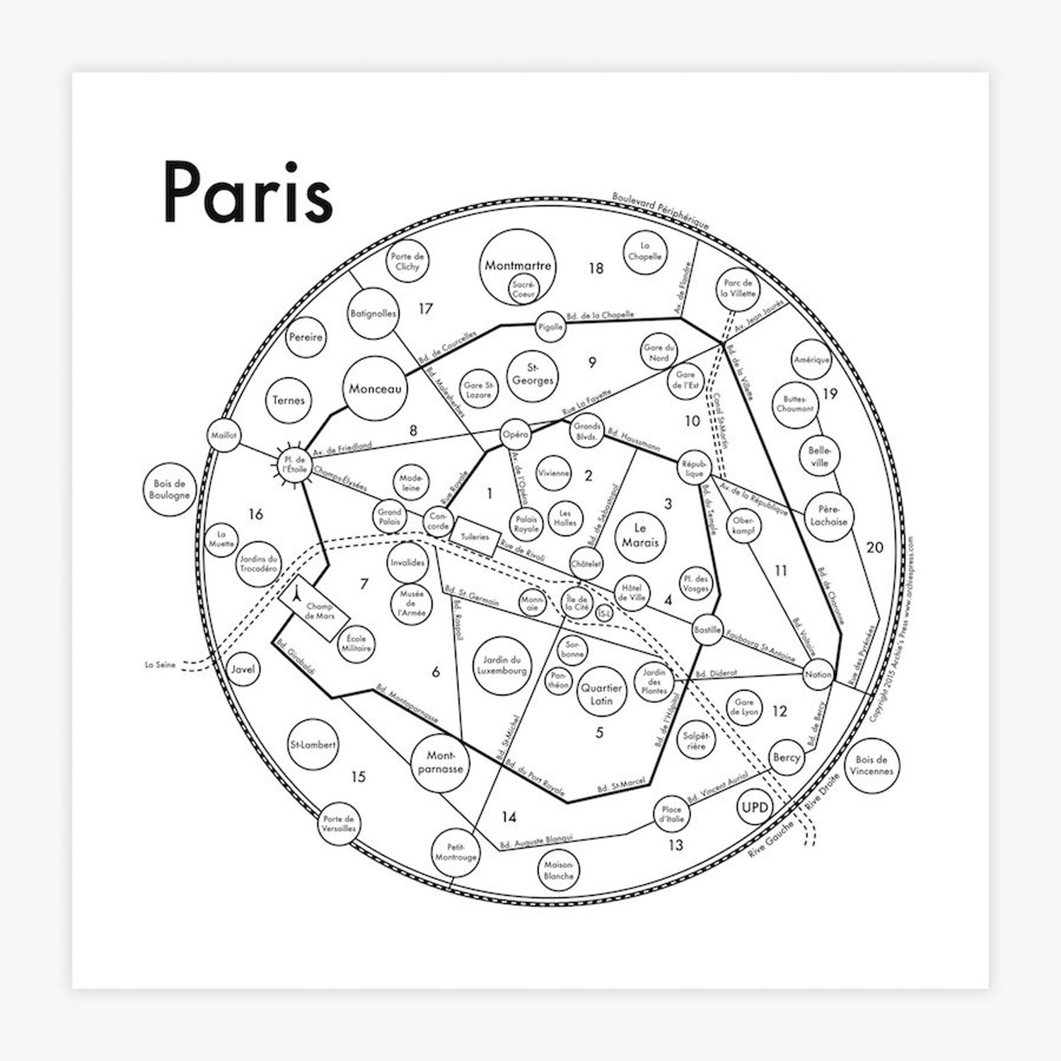 Sacré Bleu! C'est Magnifique! Possibly the most legendary city in the world, it also fits pretty nicely into a circle. This map is based on Archie’s explorations, along with help from people who have lived in the city for years. It's meant to offer a "mental picture" of the city, creating an immediate nostalgic understanding for old timers and a helpful navigation tool for newcomers.