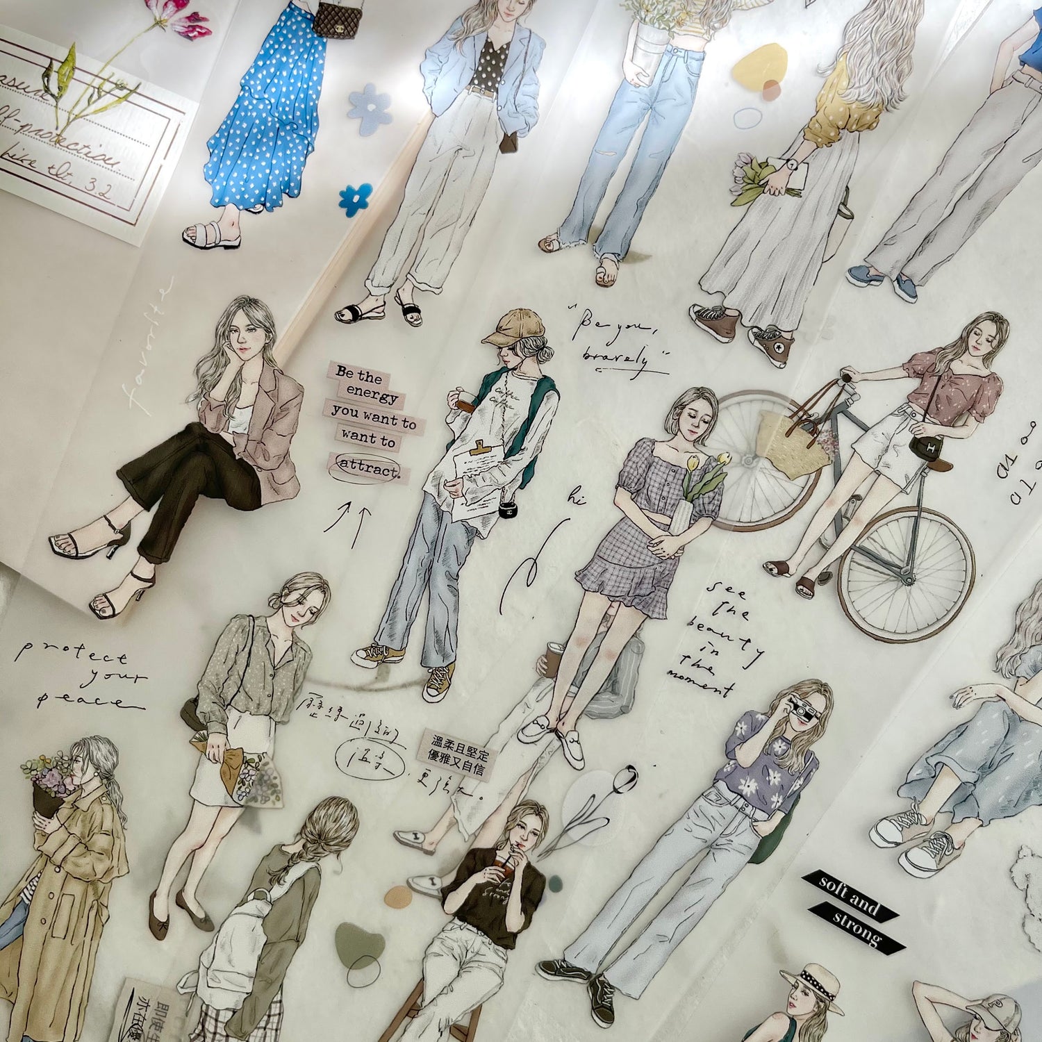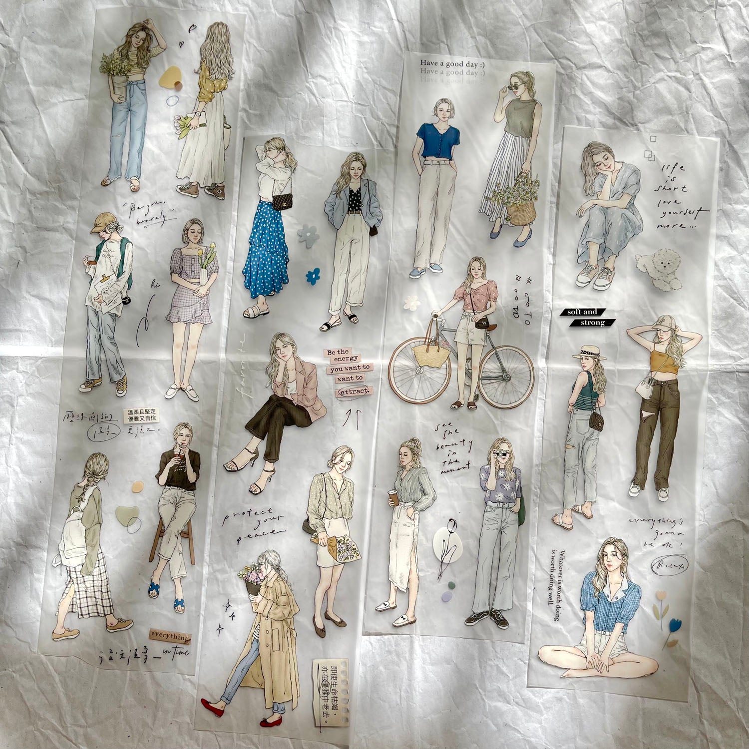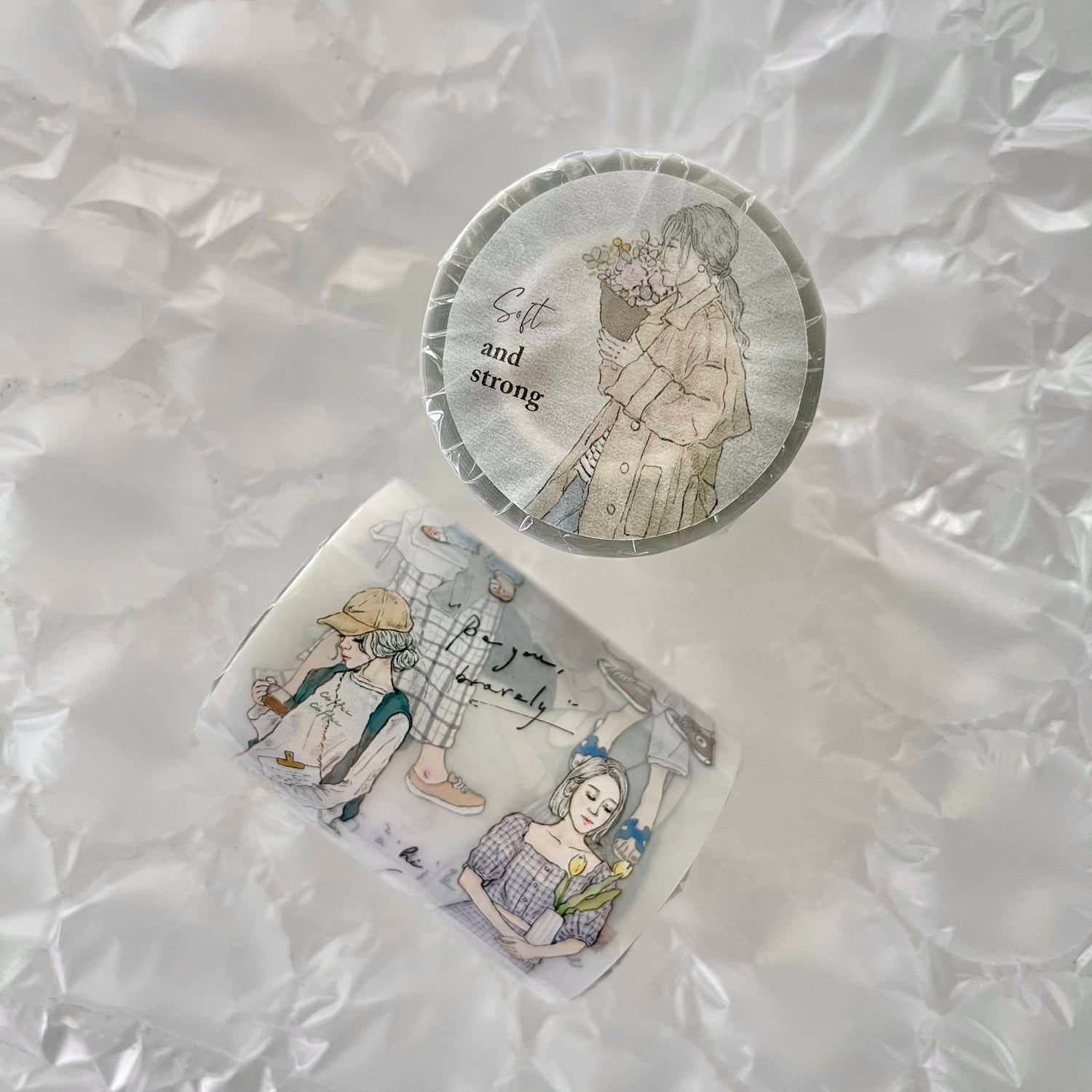 PET Tape designed by Taiwanese artist Pion, known for her delicate girl illustrations, cute flowers and animals. This tape comes with a backing release paper, which allows you to cut out the designs individually and use them as stickers. Perfect for adding a beautiful touch to your journal, planner, snail mail and craft projects!