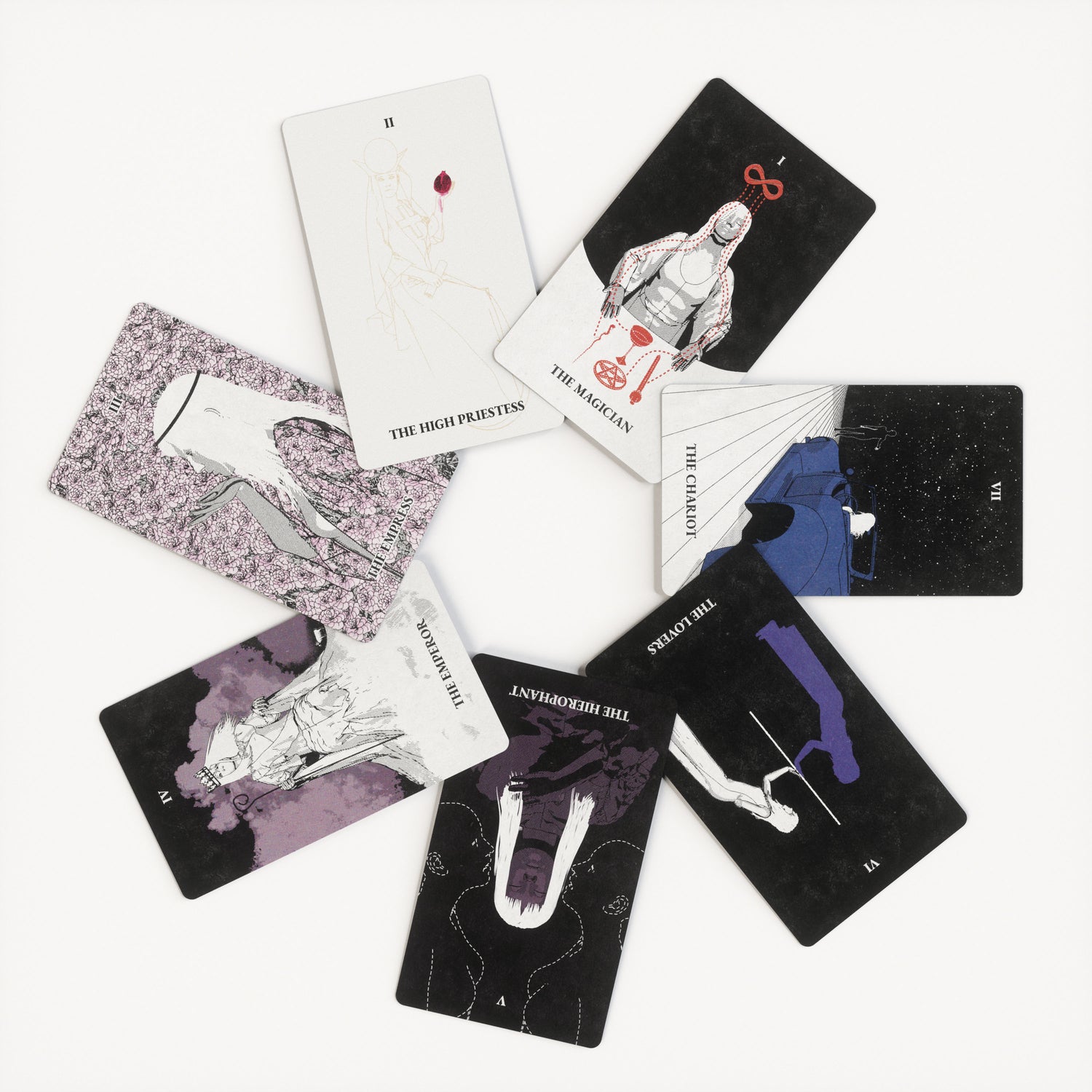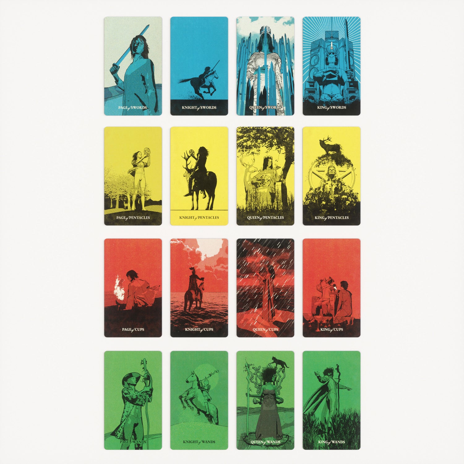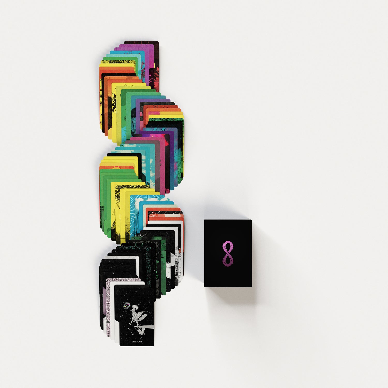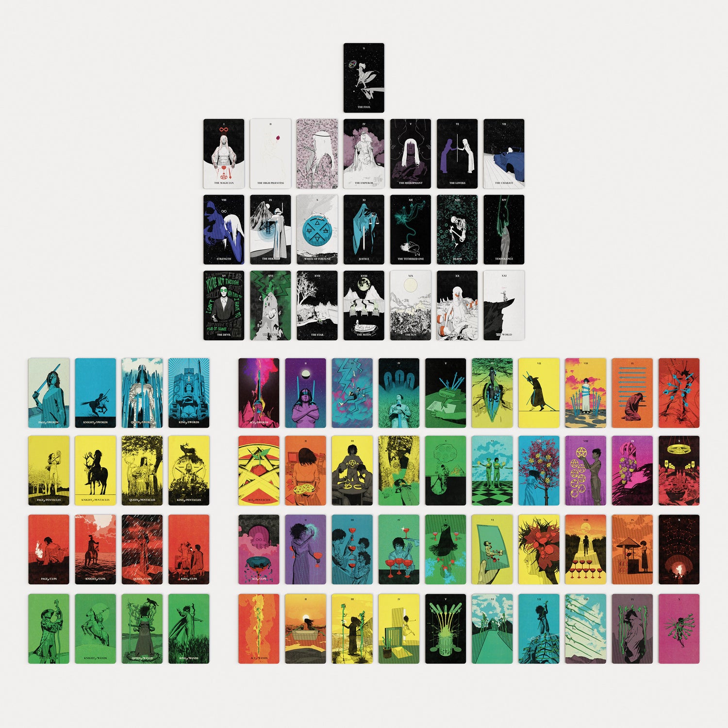 Tarot of the Holy Spectrum tells a story through color. The Major Arcana is focused in black and white with intentional pops of color, while each of the Minor Arcana suits progresses through the color spectrum.