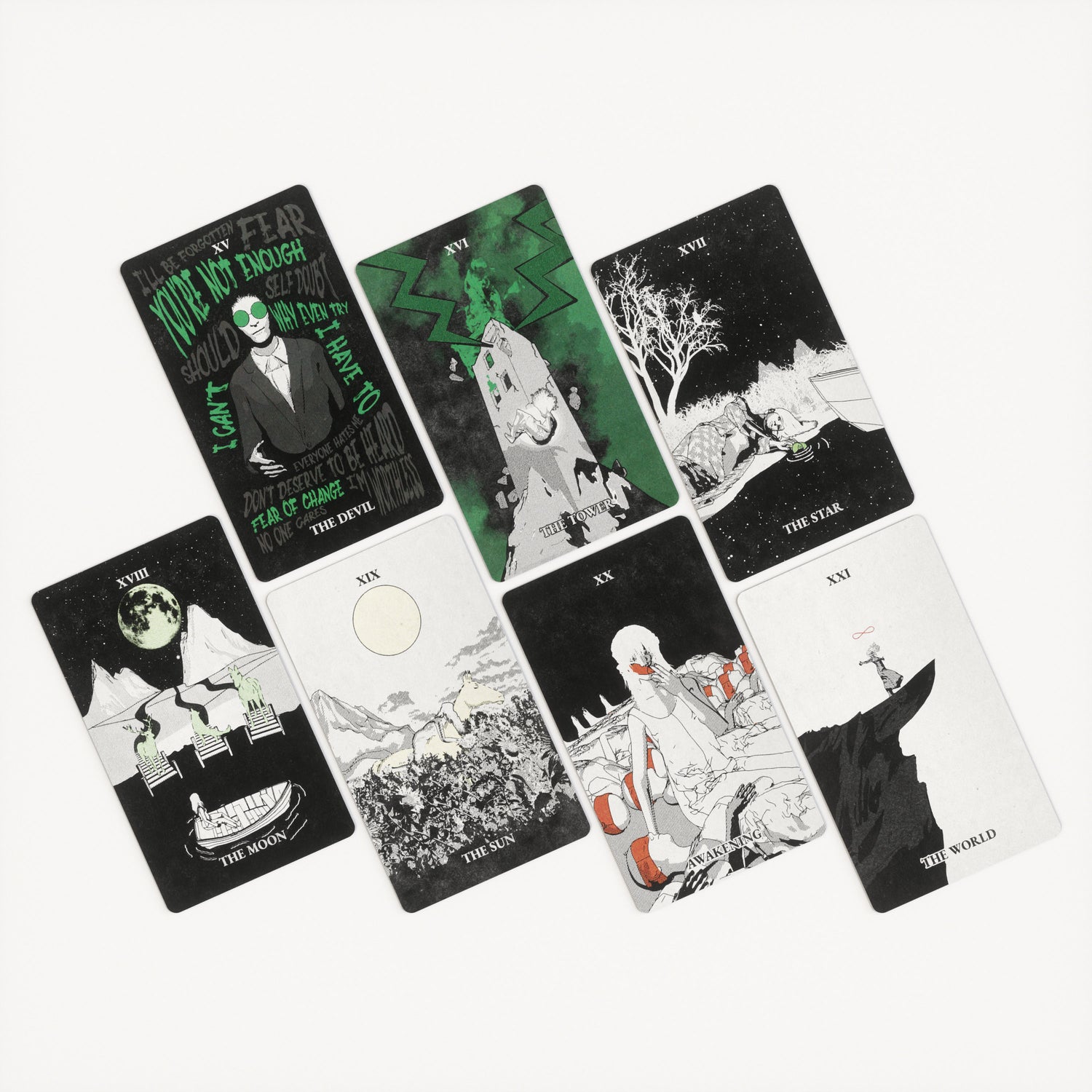 The cards are printed on beautiful, high quality 350gsm Art Paper, featuring a matte black finish on both the backs and the edges of the cards. The artistic intention around this choice was to create the illusion of a black void when the deck is face down. Each time you reach for your deck, it offers the ritual of reaching into the unknown to receive guidance and clarity from the cards.