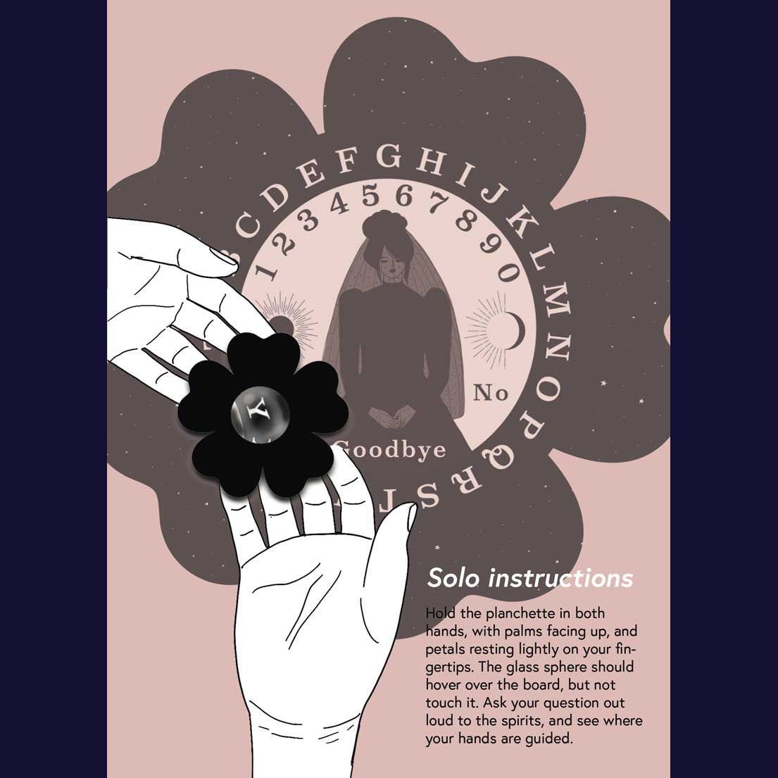 - A custom-printed cardboard box that fits the folded board + planchette for safe keeping.