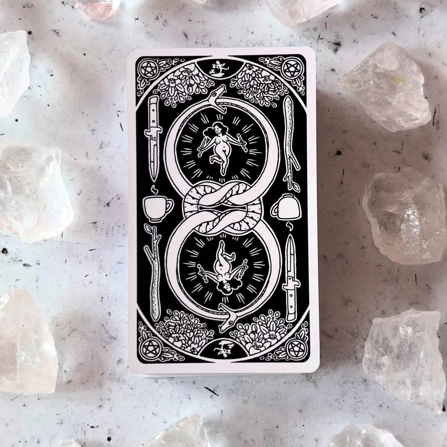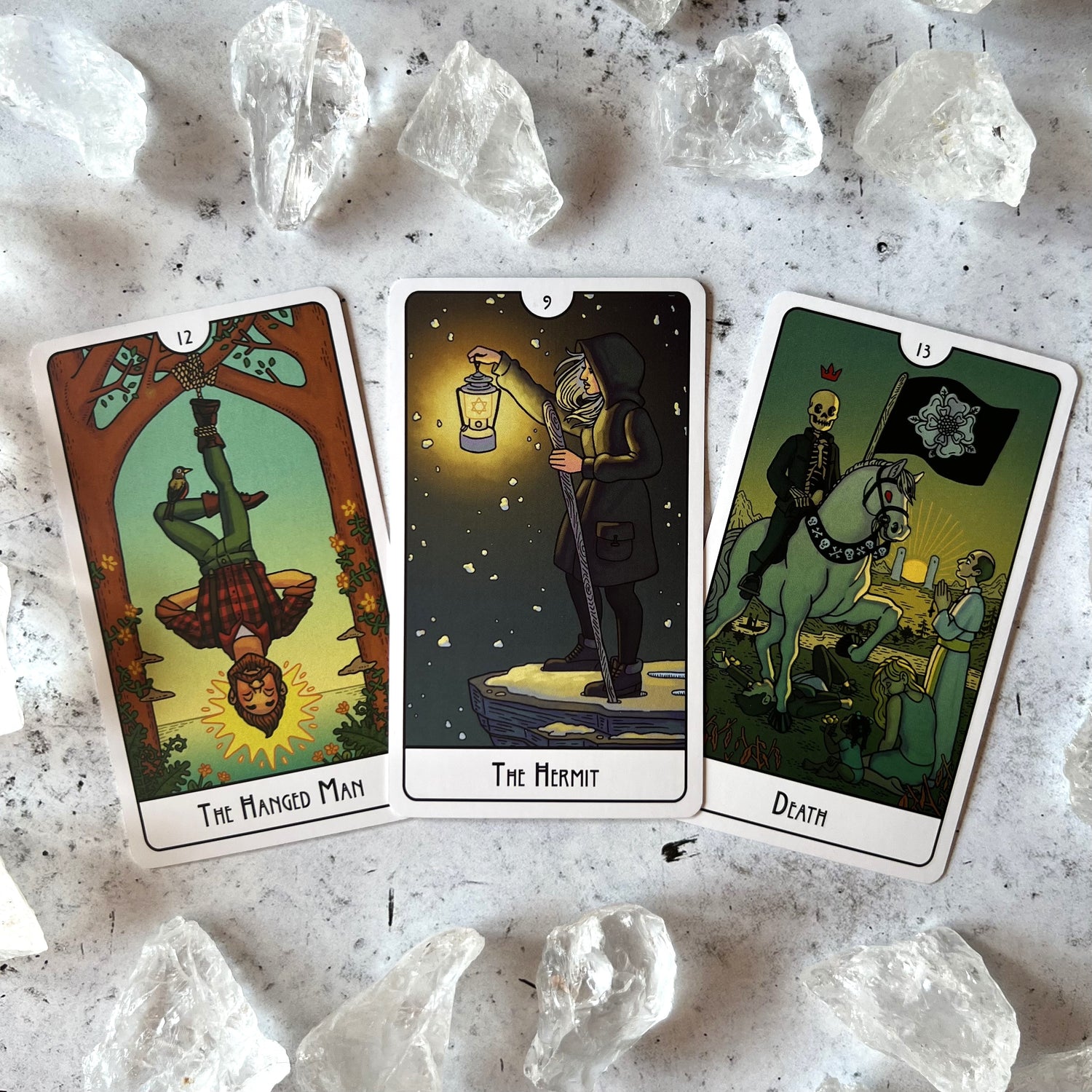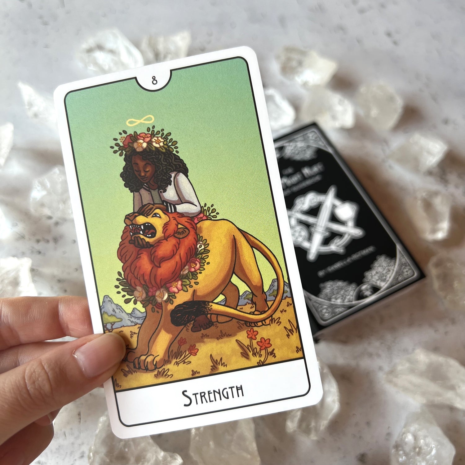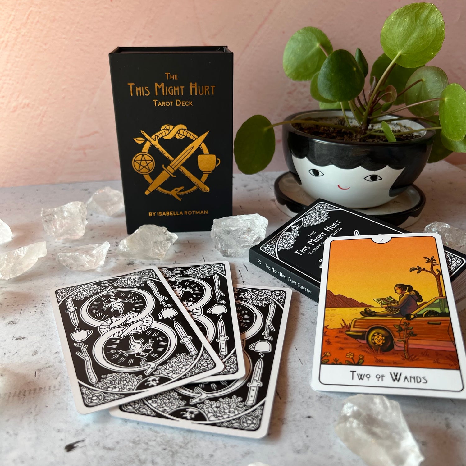 An indie tarot deck by Isabella Rotman, This Might Hurt Tarot is modern, diverse, joyful and queer. Honoring the Rider Waite Smith tradition, the This Might Hurt Tarot provides a modern update that is grounded in today’s reality. Drawn in the image of our world, all of the court cards and a few of the Minor Arcana cards are portraits of real people in the artist’s life. The result is a highly relatable deck that is easy to read, perfect for beginners and experienced readers alike.