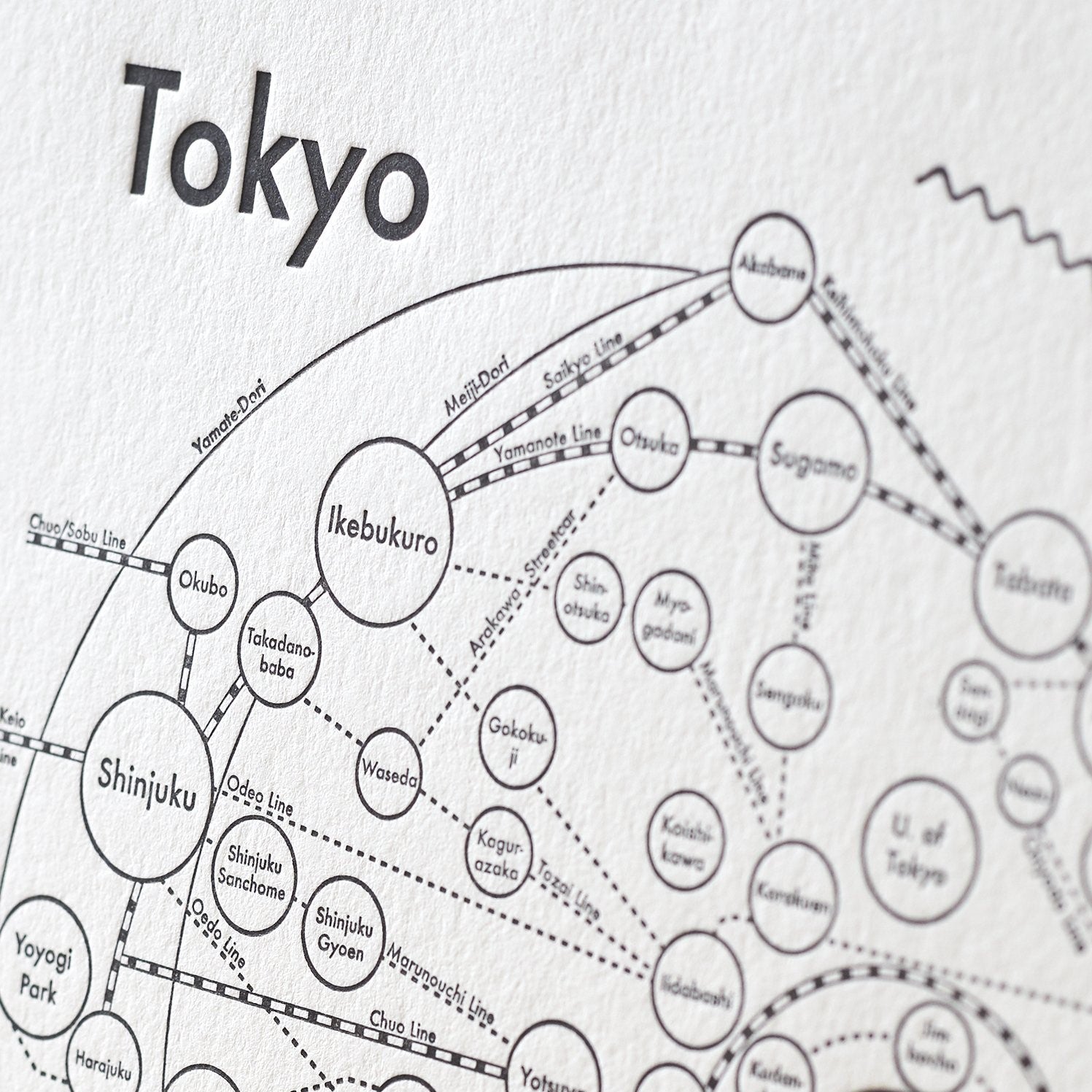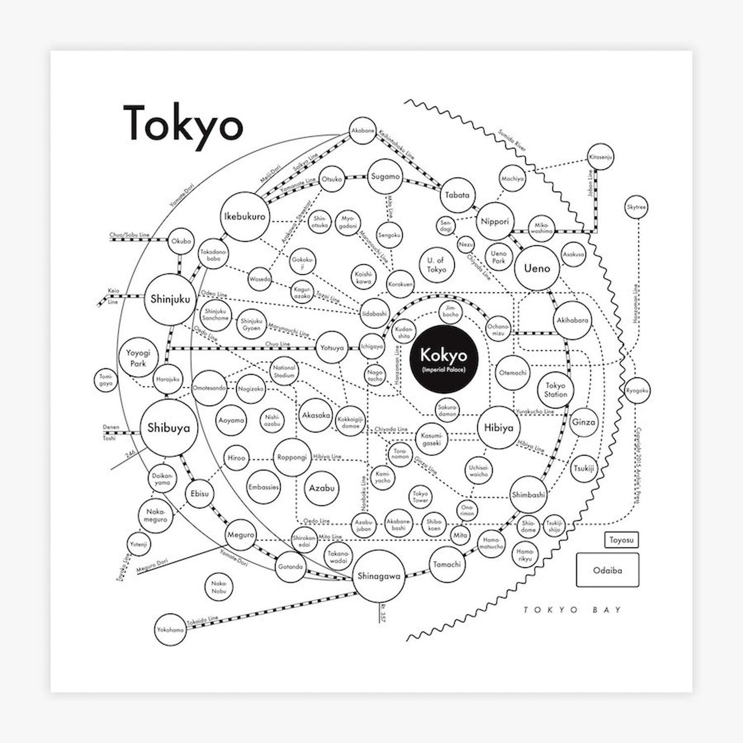 A simple map of Tokyo, describing the ring of the Yamanote line and all the station-named neighbourhoods around it. Tokyo was actually designed to BE CONFUSING. The streets have no names (really) and they are mashed together in a baffling maze. At every subway station, there's an incredibly thorough map that explains the immediate area. Before phones, these were essential for anyone finding anything ever.